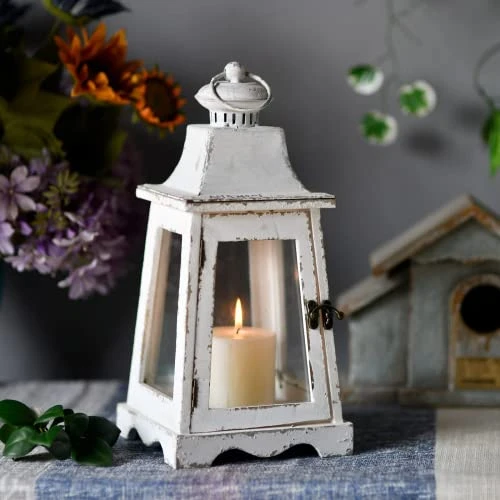 - [PERFECT DECORATION] Decorative candle lantern, great idea for the Tabletop, Shelf, Stairs, Pathway, Wall, Patio, Porch etc. Outdoor or indoor hanging lantern, the hanger allow you to hang them on the tree or hook. The distressed coating creates an farmhouse style will be an attractive home decoration for Wedding, Party, Halloween, Thanksgiving and Christmas.