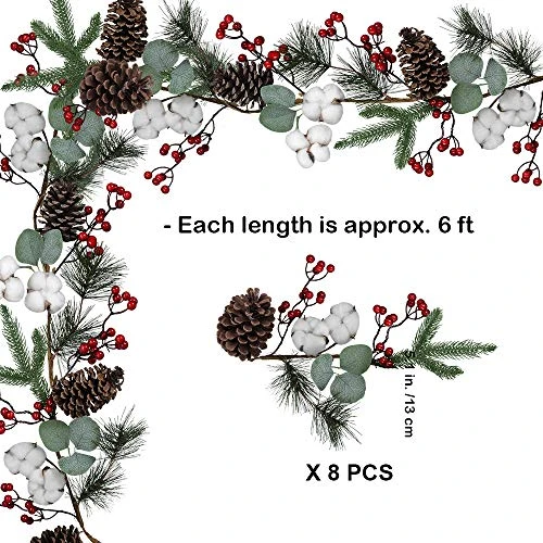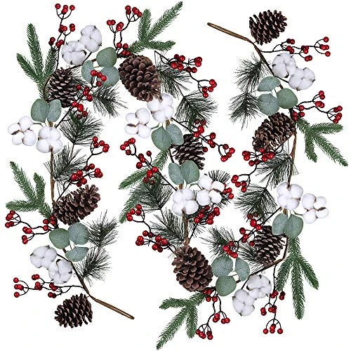 - Color: Blooming with festive style, this garland features a beautiful blend of realistic pine needles, spruce branches, berries, pinecones, eucalyptus leaves and cotton balls, full of holiday colors and Christmas charm!