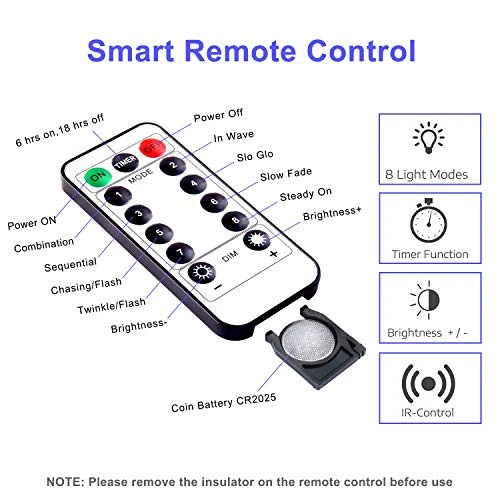 - ❤Mode & Remote Control — ❤The Christmas lights have 8 modes lighting, switch modes by the button on battery box or remote control. The remote control can also adjust brightness and set timer, which makes the twinkle lights automatically 6 hours on and 18 hours off per day.