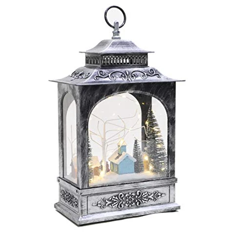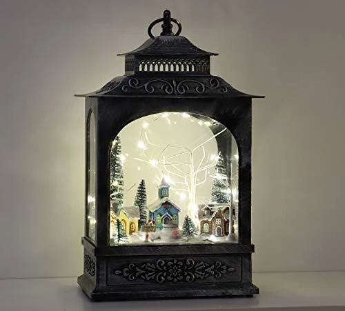 - Measures approximately 40cm and features moving parts and a full traditional Christmas village scene inside the lantern including, Church, Trees, Houses, Moving ice rink. This lantern also features traditional Christmas melodies which can be turned off to have just the LED lights on.