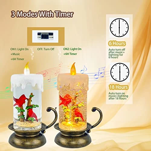 - 【Music Playing】- The christmas lantern snow globe cardinal water lantern candle can play 8 Christmas music: Jingle Bells, We Wish You A Merry Christmas, Silent Night, Deck The Halls, Joy To The World, The First Noel, Hark! The Herald Angel Sing and Oh, Christmas Tree, battery operated snow globe for christmas musical snow globes very beautiful.