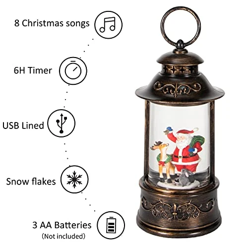 - 【TWO POWER MODEL】The Decorative Snow Lantern will come with a USB DC cable. Just keep the USB DC cable being inserted into the Decorative Snow Lantern, it will keep working and without needing any batteries. But, sometimes in order to make it convenient, put it in different places, the snow globe also uses 3 AA batteries (not included) for making the Decorative Snow Lantern working.