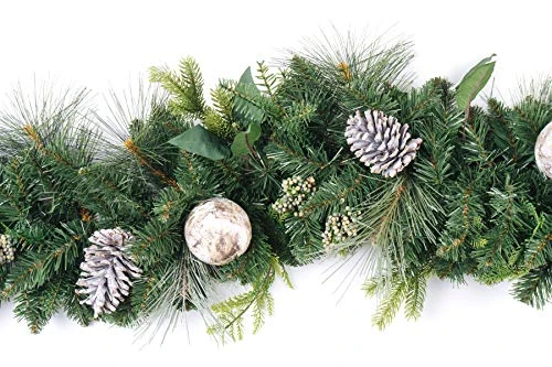 - Decorated with birch Christmas balls, leaves, white pine cones, and berries