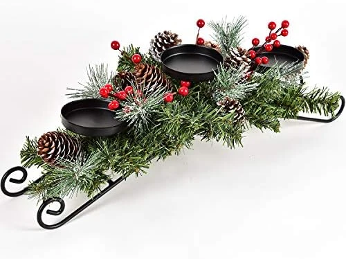 - 【Festival Candle Holder】– This centerpiece features three steel plates each hold a single pillar style candle, and large pine cones, holly berry picks and green crafted branches.