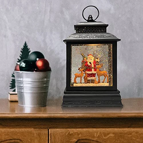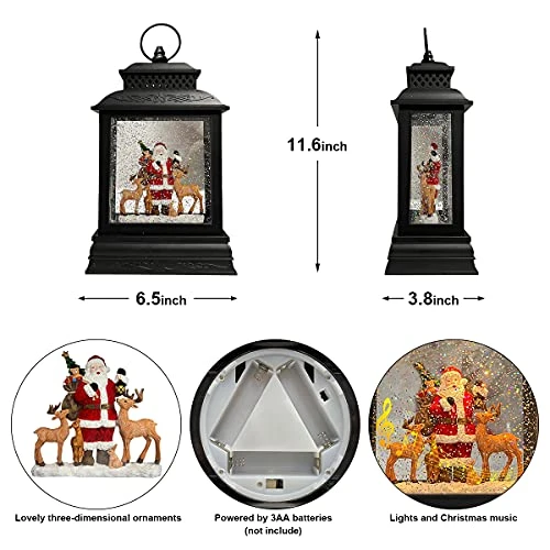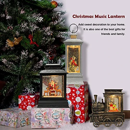 - [Design] This Decoration Adopts the Design of the Old Times and Metaphorical Fairy Tales. The Unique Classical Design of the Train and the Setting on Santa Claus and Reindeer in the Lantern Give this Decoration a Very Strong Christmas Atmosphere. The Water Glittering Under the Warm Light creates Amazing Snowfall Effect that Covers the Santa, which is so Eye-Catching and Amazing Christmas Atmosphere. A Wonderful Christmas Music Lantern Must be an Ideal Gift for your Family and Friends.