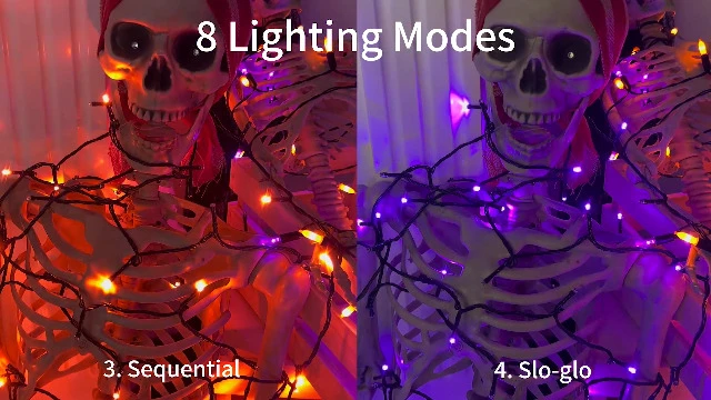 - 8 Lighting Functions with Memory Function: Our Halloween string lights have 8 lighting modes- combination, in waves, sequential, slogs, chasing/flash, slow fade, twinkle/flash, and steady on. Just pressing the round button on the transformer to change the lighting modes. Comes with memory function, will remember last setting automatically after cutting off the power, no need to reset again