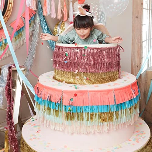 - LAYERED. Beautifully crafted from 2 layers of pink tinsel fringe and pink ribbon