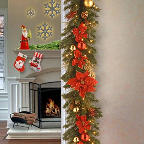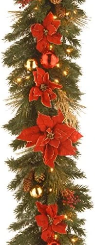- BUILT-IN LIGHTING: Neatly trimmed with pine cones, gold twigs, red berries, poinsettia flowers, and ball ornaments, decorated across 100 UL white lights for a warm seasonal glow.