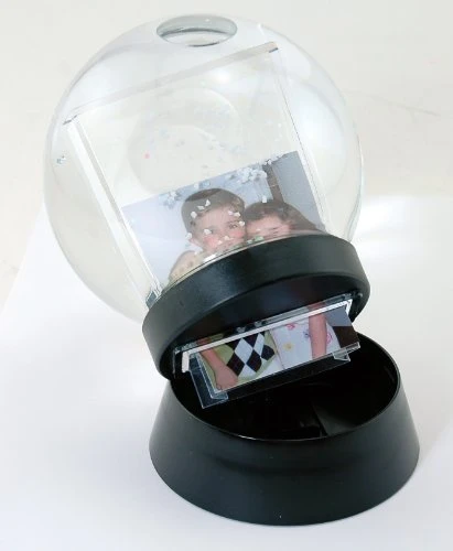 - To insert your images, pull the black base in one hand and the globe portion in the other hand wiggle the base from side to side. Slide your photos in the compartment, leave the clear plastic insert inside to hold the photos in place. Then replace the black base and shake!