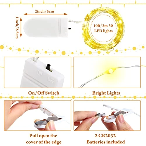 - Battery Operated: each fairy lights string is equipped with a battery box with on or off switches, simply slide the switch to turn off or on the lights and enjoy the beautiful scenery, the string lights are battery operated and come with 2 pieces CR2032 batteries, which can last for about 48 hours; Batteries need to be replaced when the lights get dim, LED lights will last more with regular battery changes