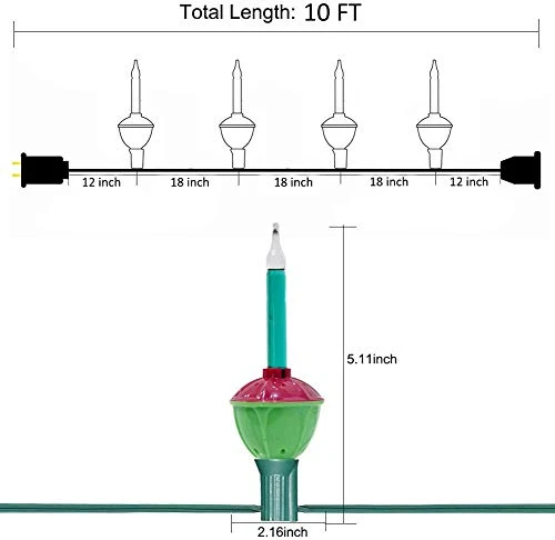 - Total10′ long with 18″ spacing between lights and you can connect 5 sets end to end for 12′ on each plug.