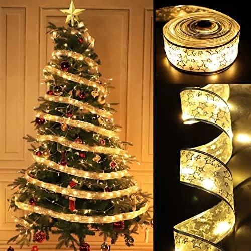 - [ Double-sided Star Pattern Design ] Featuring with Double-sided silver/golden star pattern design. 2 Lighting colors are available: cool white/warm white. There are built-in iron wire at the both ends of ribbon Christmas lights, so you can bend it into any shapes, such as bow,etc. And it will keep that shape a long time.