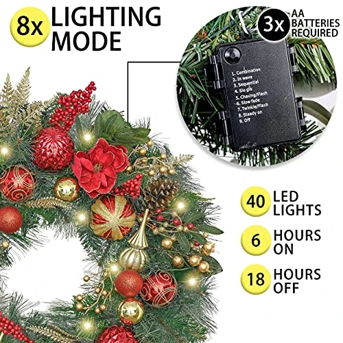 - 【Battery Operated LED Light】 – This wreath with lights is 6 hours on, 18 hours off, auto-cycle daily, dimmable with 8 light effect. 3 AA batteries required (not included)