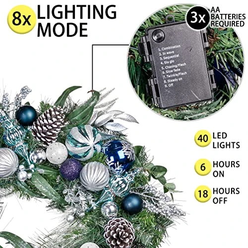 - 【Battery Operated LED Light】 – This wreath with lights is 6 hours on, 18 hours off, auto-cycle daily, dimmable with 8 light effect. 3 AA batteries required (not included)