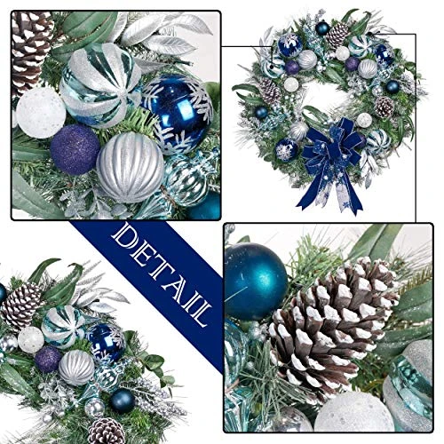 - 【Very Full and Large】- This 30” large Christmas wreath is full of Christmas balls, pine cones, silver berries, bow ribbons, pine needles and other rich elements, creating a winter wonderland scene, bringing festive atmosphere