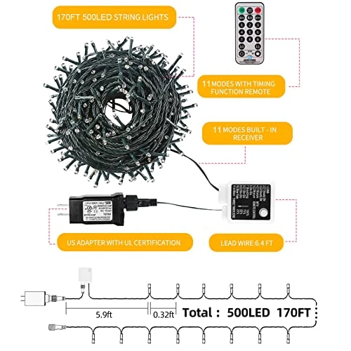 - Expandable – Each Christmas tree light comes with an end-to-end plug, which makes you can connect max 2sets together. Each length is 170 feet with 500 LEDS, the max expandable length is 340feet with 1000 LEDS.Enough to cover a larger area.