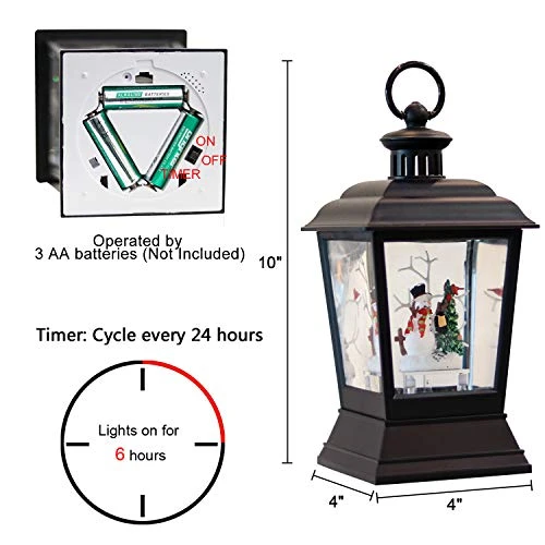 - ☃EASY TO USE: With 3 AA batteries(Not Included), the water lantern can continuous work for more than 120 hours. Slide the bottom switch to Timer position, the snow globe lantern will light up for 6 hours and off for 18 hours, cycle every day.